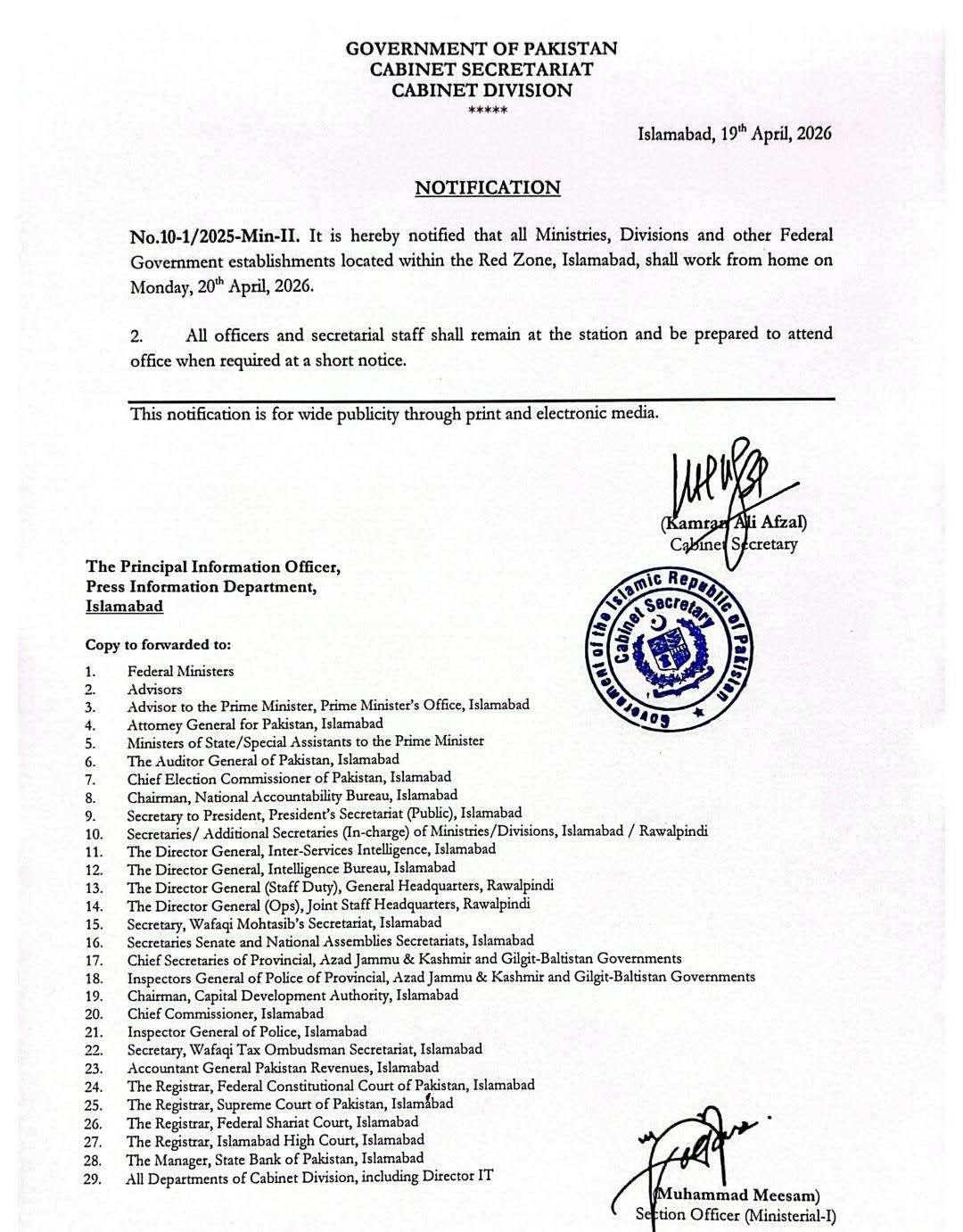 当地时间19日晚间,巴基斯坦政府发布通告,要求位于伊斯兰堡“红区”内的部委、机关和政府机构于20日实行居家办公,官员和秘书人员需要随时待命,必要时应在短时间内返回岗位履职。